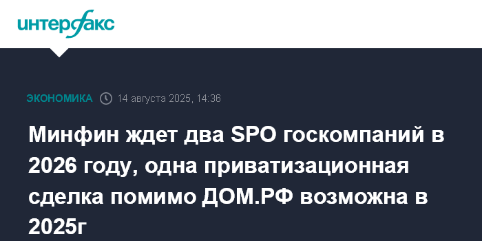 Минфин ждет два SPO госкомпаний в 2026 году, одна приватизационная сделка помимо ДОМ.РФ возможна в 2025г