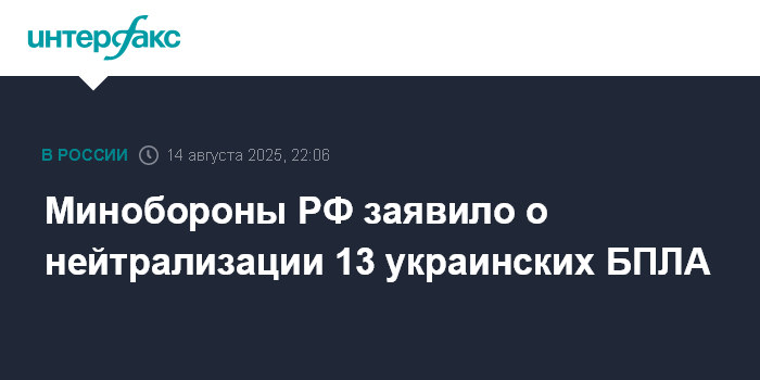 Москва. 14 августа. INTERFAX.RU - Минобороны РФ сообщило, что 13 украинских беспилотников перехвачены и уничтожены в четверг вечером над Белгородской, Ростовской областями и Калмыкией.