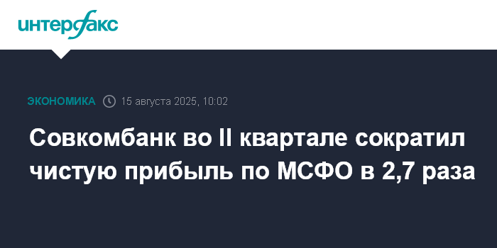 Москва. 15 августа. INTERFAX.RU - Совкомбанк во втором квартале 2025 года сократил чистую прибыль по МСФО в 2,7 раза - до 5 млрд рублей по сравнению с 13,7 млрд рублей за аналогичный период 2024 года, следует из пресс-релиза банка.