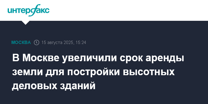 Москва. 15 августа. INTERFAX.RU - Правительство Москвы решило увеличить максимальный срок аренды земельных участков для возведения высотных деловых зданий, сообщает пресс-служба градостроительного комплекса.