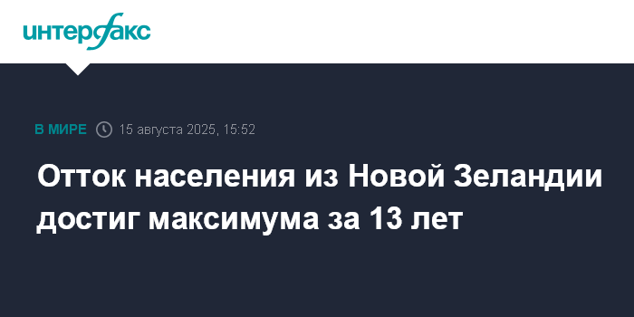 Москва. 15 августа. INTERFAX.RU - Отток населения из Новой Зеландии за 12 месяцев по июнь 2025 года достиг максимума за 13 лет на фоне роста безработицы и слабости экономики, причем более трети покинувших страну - молодые люди в возрасте до 30 лет, следует из данных статистического управления страны.