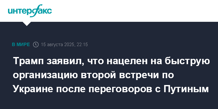 Москва. 15 августа. INTERFAX.RU - Президент США Дональд Трамп в пятницу заявил, что его цель - провести вторую встречу по украинскому урегулированию по итогам переговоров с президентом России Владимиром Путиным на Аляске.