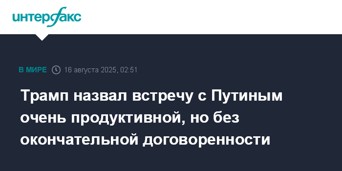 "Я считаю, что у нас была очень продуктивная встреча: по многим вопросам мы пришли к согласию", - сказал Трамп по завершении переговоров с президентом РФ Владимиром Путиным в Анкоридже.