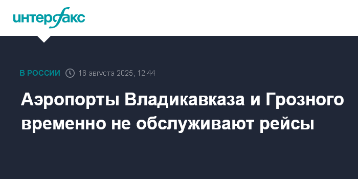 Москва. 16 августа. INTERFAX.RU - Временные ограничения на прием и вылет самолетов введены в аэропортах Владикавказа (Северная Осетия - Алания) и Грозного (Чеченская Республика), сообщил в субботу представитель Росавиации в своем-телеграм-канале.