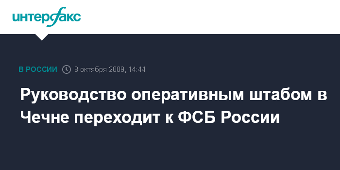 Москва. 8 октября. INTERFAX.RU - Руководство оперативным штабом в Чеченской республике перешло от МВД РФ к ФСБ.