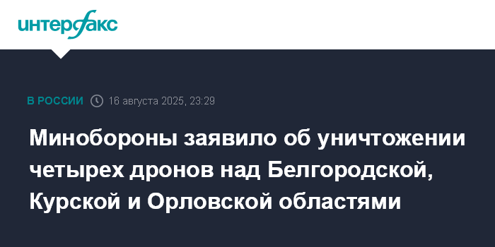Москва. 16 августа. INTERFAX.RU - Минобороны РФ сообщило, что четыре украинских беспилотника сбиты в субботу вечером над Белгородской, Курской и Орловской областями.