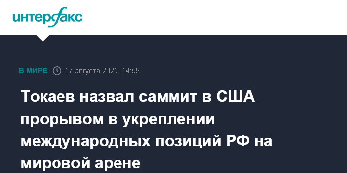 В ходе телефонного разговора Токаев заявил, что переговоры содействовали лучшему пониманию американской стороной российской позиции по Украине, что поможет найти точки соприкосновения по этой сложной проблеме. "Касым-Жомарт Токаев считает саммит на Аляске прорывным мероприятием в плане укрепления международных позиций России и взаимопонимания на мировой арене", - говорится в сообщении.