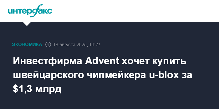Москва. 18 августа. INTERFAX.RU - Инвестиционная компания Advent International сделала предложение о покупке швейцарского чипмейкера u-blox Holding примерно за 1,05 млрд швейцарских франков ($1,3 млрд).