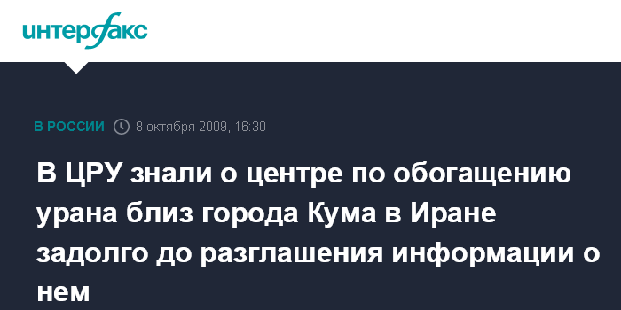Москва. 8 октября. INTERFAX.RU - Сотрудники ЦРУ еще три года назад получили данные о строительстве второго центра по обогащению урана в районе иранского города Кум, несмотря на то, что власти Ирана пытались скрыть информацию о нем, сообщил американский журнал "Тайм".