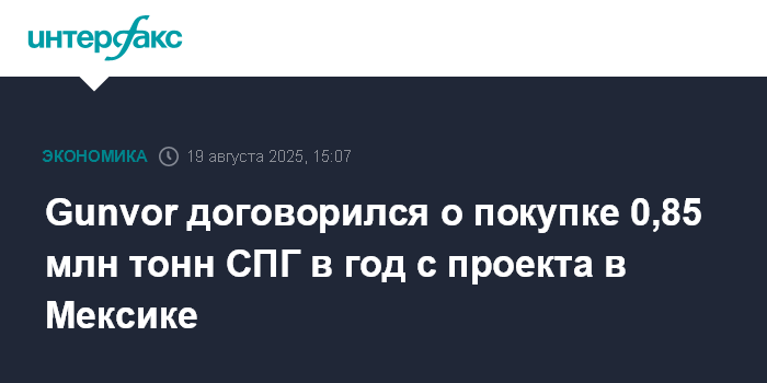 Москва. 19 августа. INTERFAX.RU - Швейцарский трейдер Gunvor подписал соглашение о покупке 0,85 млн т сжиженного природного газа в год с компанией Amigo LNG (совместное предприятие техасской Epcilon LNG и сингапурской LNG Alliance), сообщил трейдер.