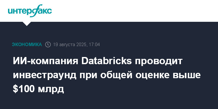 Москва. 19 августа. INTERFAX.RU - Американский разработчик программного обеспечения на основе искусственного интеллекта (ИИ) Databricks Inc. согласовал условия нового инвестраунда с оценкой выше $100 млрд, говорится в его пресс-релизе.