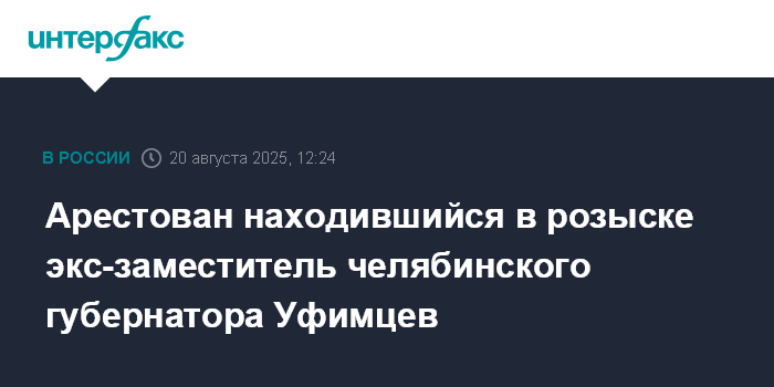 Москва. 20 августа. INTERFAX.RU - Находившийся с 2018 года в розыске фигурант уголовного дела о мошенничестве, бывший заместитель губернатора Челябинской области Александр Уфимцев задержан в Челябинске и отправлен под арест, сообщает пресс-служба Следственного комитета РФ в среду.