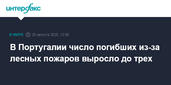 Москва. 20 августа. INTERFAX.RU - В Португалии число погибших в результате природных пожаров увеличилось до трех человек, сообщает EFE.