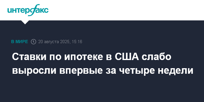 Москва. 20 августа. INTERFAX.RU - Средний размер ставок по долгосрочным ипотечным кредитам в США на прошлой неделе увеличился всего на 1 базисный пункт после трех недель снижения кряду, оставшись вблизи минимального уровня с начала апреля.