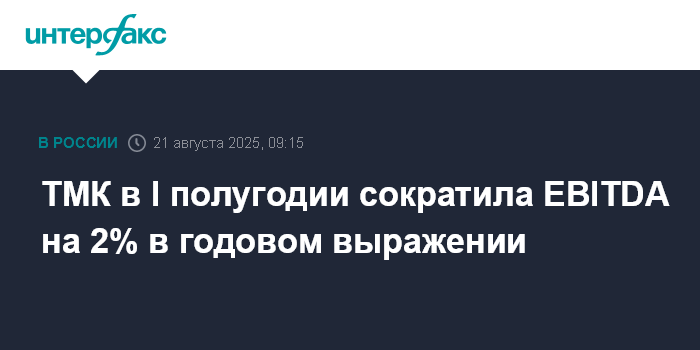 Москва. 21 августа. INTERFAX.RU - "Трубная металлургическая компания" (ТМК) в первом полугодии 2025 года сократила EBITDA на 2% по сравнению с аналогичным периодом прошлого года - до 45,084 млрд рублей по сравнению с 46,033 годом ранее, говорится в отчетности компании.