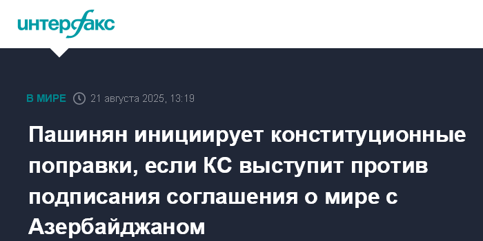 Москва. 21 августа. INTERFAX.RU - Премьер-министр Армении Никол Пашинян заявил о готовности инициировать конституционные поправки, если Конституционный суд республики выступит против подписания соглашения о мире с Азербайджаном.