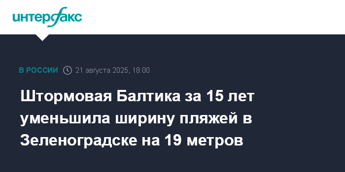 Москва. 21 августа. INTERFAX.RU - Авандюну и пляжи в районе курортного Зеленоградска в Калининградской области предстоит защитить от размыва Балтикой, так как за последние 15 лет ширина берега сократилась на 19 метров, сообщила государственное бюджетное учреждение Калининградской области "Балтберегозащита" на своей странице "ВКонтакте".