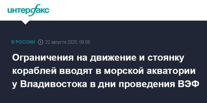 Москва. 22 августа. INTERFAX.RU - Запрет на плавание вблизи Владивостока всех типов судов, кроме специальных кораблей и транспорта пассажирских линий, вводится с 2 по 6 сентября для обеспечения безопасности проведения Восточного экономического форума, сообщает в пятницу пресс-служба правительства региона.