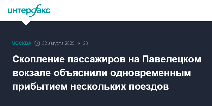 Москва. 22 августа. INTERFAX.RU - Скопление пассажиров на Павелецком вокзале, которое наблюдалось утром в пятницу, связано с одновременным прибытием нескольких поездов дальнего и пригородного сообщения, сообщили "Интерфаксу" в пресс-службе Московской железной дороги (МЖД).