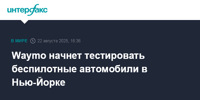 Москва. 22 августа. INTERFAX.RU - Американская Waymo (входит в Alphabet Inc.), специализирующаяся на беспилотных автомобилях, получила разрешение начать тестирование ограниченного числа машин в отдельных районах Нью-Йорка.