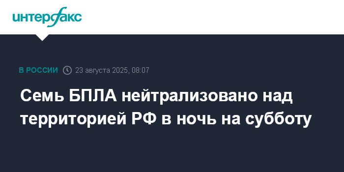Москва. 23 августа. INTERFAX.RU - Российские военные в ночь на субботу перехватили и уничтожили семь беспилотников над тремя южными регионами РФ, сообщили в Минобороны России.