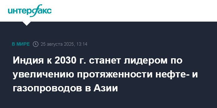 Москва. 25 августа. INTERFAX.RU - Растущий спрос на энергоносители в развивающихся странах и ряд других факторов будут способствовать развитию трубопроводной инфраструктуры в Азии, при этом Индия к 2030 году станет лидером в регионе по увеличению протяженности нефте- и газопроводов, пишет отраслевое издание Offshore Technology со ссылкой на исследование GlobalData Energy.