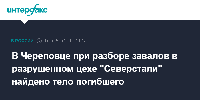 Москва. 9 октября. INTERFAX.RU - Спасатели, разбирающие завалы на месте обрушения конструкций цеха Череповецкого металлургического комбината ОАО "Северсталь", накануне вечером нашли тело одного погибшего, сообщил "Интерфаксу" в пятницу руководитель пресс-службы МЧС по Вологодской области Виктор Ковальков. По его словам, из-под завалов извлечено тело слесаря-монтажника ООО "Северный рудник-Л" Антипова, 1986 г.рождения. Поиски второго рабочего, электрогазосварщика того же ООО Х.Алибекова, 1966 г.р., продолжаются.