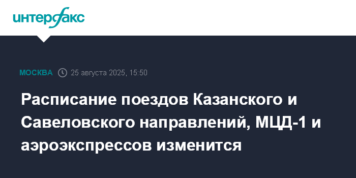 Москва. 25 августа. INTERFAX.RU - График движения ряда пригородных поездов Казанского и Савеловского направлений, в том числе первой линии Московских центральных диаметров (МЦД-1, D1) и аэроэкспрессов, поменяется с 25 августа в связи с развитием инфраструктуры, сообщили в Московской железной дороге (МЖД).