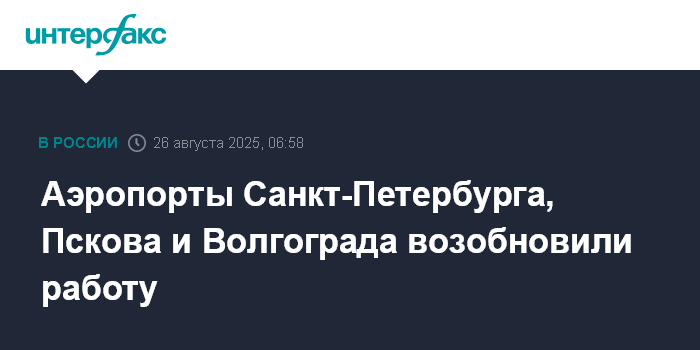 Москва. 26 августа. INTERFAX.RU - Аэропорты Санкт-Петербурга, Пскова и Волгограда вновь принимают и отправляют рейсы, сообщил представитель Росавиации Артем Кореняко.