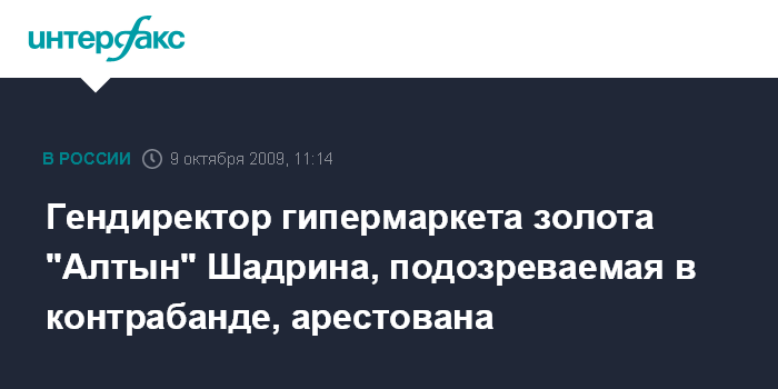Москва. 9 октября. INTERFAX.RU - Лефортовский суд Москвы выдал санкцию на арест гендиректора гипермаркета золота "Алтын" Валентины Шадриной, подозреваемой в контрабанде в крупном размере. "Лефортовский суд Москвы вынес постановление, согласно которому в отношении Шадриной избрана мера пресечения в виде заключения под стражу", - сообщила "Интерфаксу" руководитель пресс-службы Мосгорсуда Анна Усачева. Таким образом, суд удовлетворил ходатайство ФСБ РФ об аресте Шадриной, подозреваемой в совершении преступления, предусмотренного ч. 4 ст. 188 УК РФ (контрабанда).
