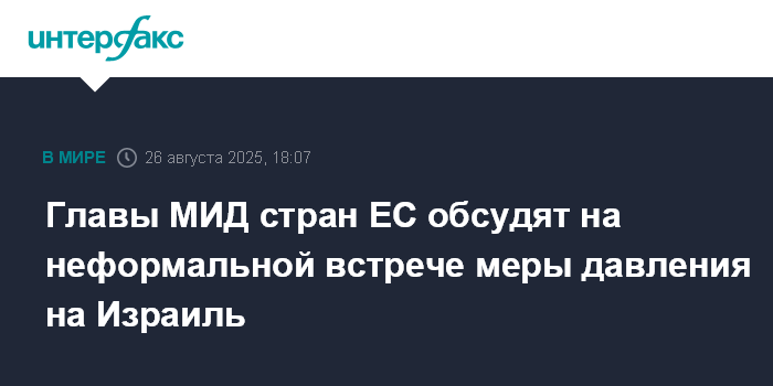 Москва. 26 августа. INTERFAX.RU - Усиление давления на Израиль для прекращения войны в секторе Газа будет одной из тем при обсуждении 29-30 августа ситуации в палестинском анклаве на неформальном Совете ЕС по иностранным делам (Гимнихе) в Копенгагене.