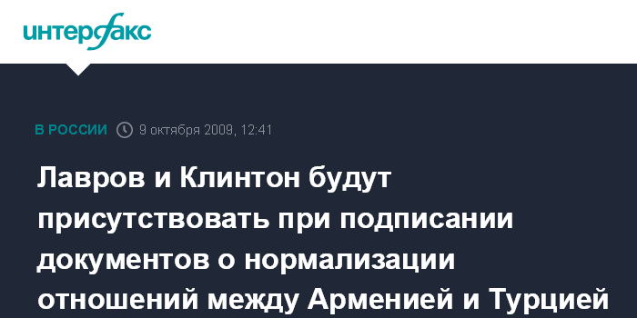 Москва. 9 октября. INTERFAX.RU - Глава МИД РФ Сергей Лавров, как ожидается, примет участие в субботу в Цюрихе в церемонии подписания армяно-турецкого соглашения о нормализации отношений. Как ранее сообщил в Вашингтоне заместитель госсекретаря США Филипп Гордон, на церемонии подписания армяно-турецкого соглашения о нормализации отношений будет присутствовать госсекретарь США Хиллари Клинтон.