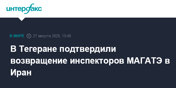 Москва. 27 августа. INTERFAX.RU - Глава иранского МИД Аббас Аракчи заявил в среду, что инспекторы МАГАТЭ прибыли в Иран для возобновления работы, сообщает "Мехр".