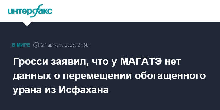 Москва. 27 августа. INTERFAX.RU - Гендиректор МАГАТЭ Рафаэль Гросси в среду заявил, что не получал данных, которые указывали бы на то, что ядерные материалы были перевезены из объекта в иранском Исфахане в другое место после ударов США в июне.