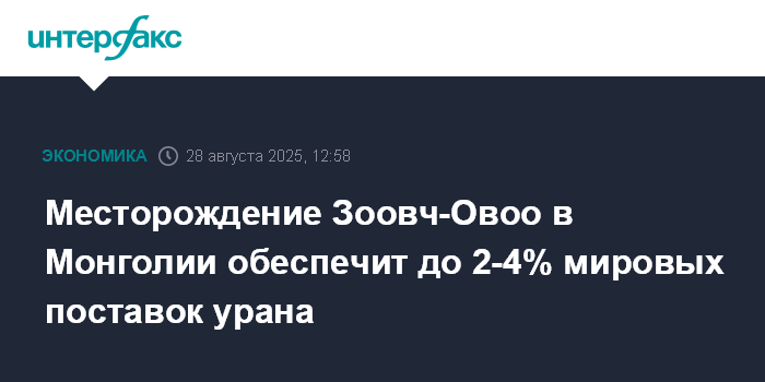 Москва. 28 августа. INTERFAX.RU - Последние геологоразведочные данные с месторождения Зоовч-Овоо в Монголии, на котором страна будет вести добычу совместно с Orano Mining (подразделение французской Orano), говорят о запасах в объеме не менее 200 тысяч тонн урана, сообщают монгольские СМИ со ссылкой на представителя Orano Mining Оливье Тумира.