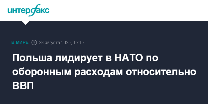 Москва. 28 августа. INTERFAX.RU - Польша является лидером НАТО по доле оборонных расходов относительно ВВП, следует из опубликованного в четверг альянсом отчета.