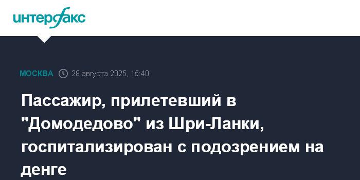 Москва. 28 августа. INTERFAX.RU - Роспотребнадзор провел противоэпидемические мероприятия после прибытия из Шри-Ланки через "Домодедово" пассажира, у которого заподозрили лихорадку денге, сообщили в управлении Роспотребнадзора по Московской области.