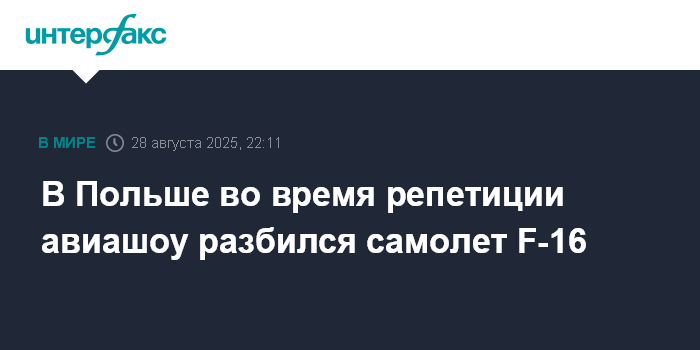 Москва. 28 августа. INTERFAX.RU - Истребитель F-16 потерпел крушение во время репетиции авиашоу в польском городе Радом, сообщили в правительстве Польши.