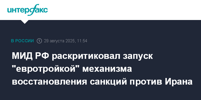 Москва. 29 августа. INTERFAX.RU - Россия осуждает запуск Великобританией, Францией и Германией механизма восстановления санкций против Ирана в связи с ядерной программой, заявили в МИД РФ.