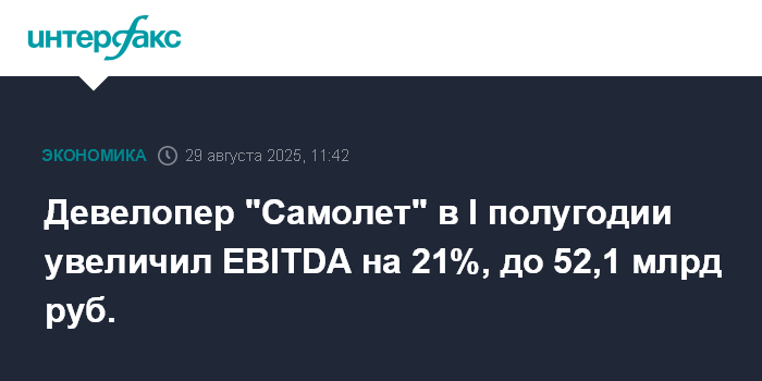 Москва. 29 августа. INTERFAX.RU - Девелопер "Самолет" в I полугодии 2025 года увеличил EBITDA по МСФО на 21%, до 52,1 млрд рублей.