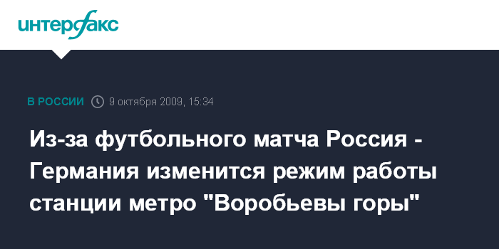 Москва. 9 октября. INTERFAX.RU - В связи с проведением в ближайшую субботу отборочного матча чемпионата мира-2010 по футболу между сборными России и Германии в Лужниках в столичном метро изменится режим работы станции "Воробьевы горы", сообщили "Интерфаксу" в пресс-службе московской подземки в пятницу. "По окончании матча 10 октября вечером "Воробьевы горы" будут работать только для выхода пассажиров", - отметил собеседник агентства. Он рассказал, что для удобства болельщиков будут организованы дополнительные маршруты автобусов от улицы Хамовнический вал до станций метро "Киевская" Кольцевой и Арбатско-Покровской линий и "Смоленская" Филевской линии. После завершения перевозки болельщиков станция "Воробьевы горы" продолжит работу в обычном режиме.