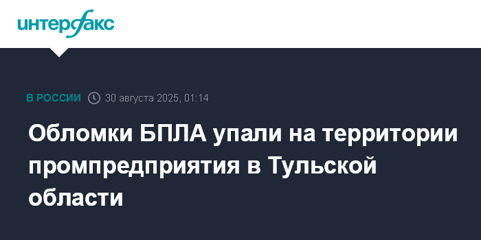 Москва. 30 августа. INTERFAX.RU - В городе Алексине Тульской области обломки БПЛА упали на территории промпредприятия, сообщил губернатор Дмитрий Миляев.
