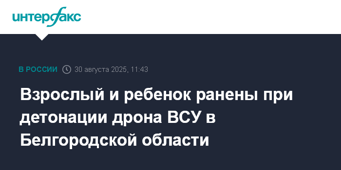 Москва. 30 августа. INTERFAX.RU - Два мирных жителя, в том числе ребенок, ранены при детонации украинского дрона в селе Смородино Грайворонского округа Белгородской области, сообщил губернатор Вячеслав Гладков.
