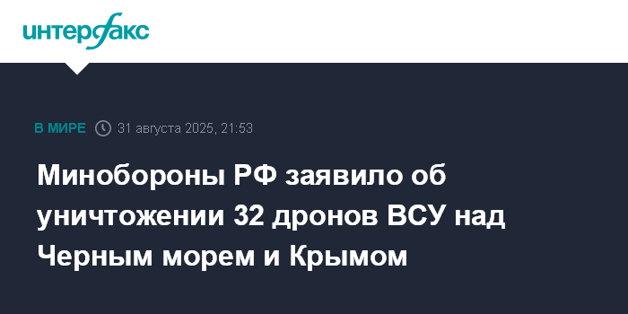 Москва. 31 августа. INTERFAX.RU - Минобороны России сообщило, что 32 украинских беспилотника самолетного типа сбиты в воскресенье вечером над Черным морем и Крымом.