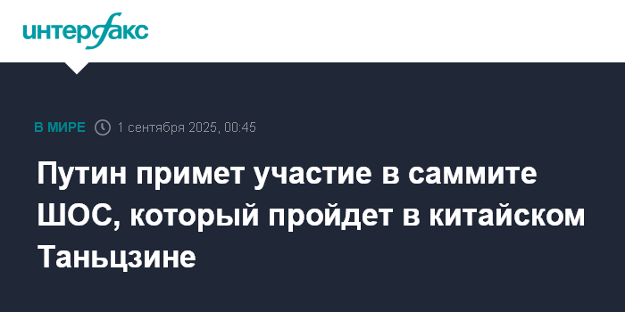 Путин примет участие в саммите ШОС, который пройдет в китайском Таньцзине
