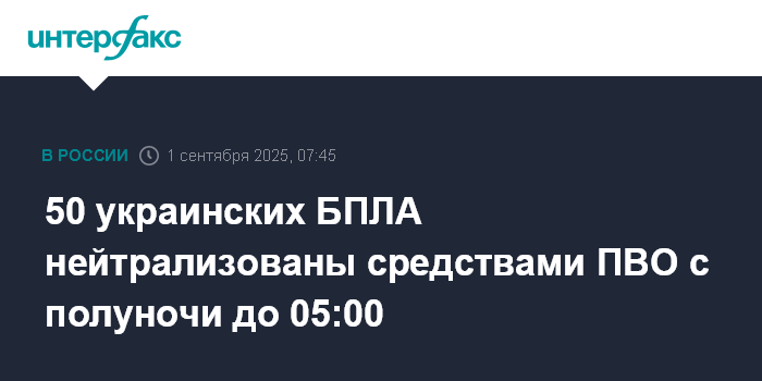 50 украинских БПЛА нейтрализованы средствами ПВО с полуночи до 05:00