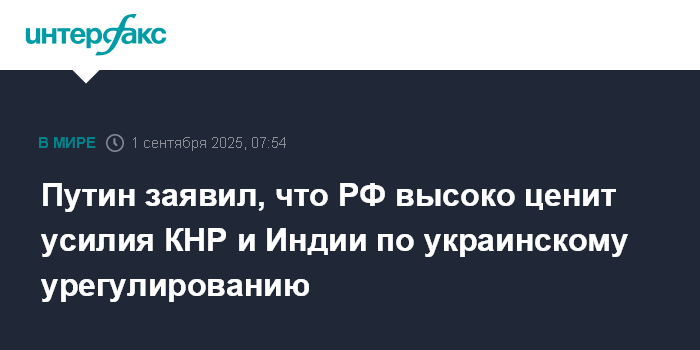 Москва. 1 сентября. INTERFAX.RU - Россия высоко ценит усилия Китая, Индии и других ее партнеров по урегулированию конфликта на Украине, заявил президент РФ Владимир Путин.