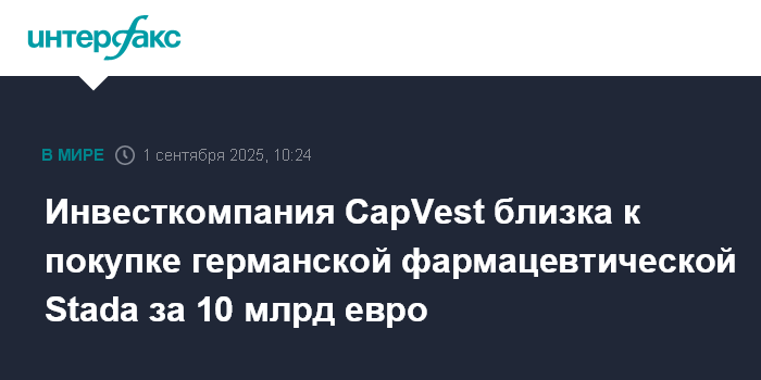 Москва. 1 сентября. INTERFAX.RU - CapVest Partners близка к покупке германской фармацевтической компании Stada Arzneimittel AG за 10 млрд евро с учетом долга. Об этом сообщает агентство Bloomberg со ссылкой на информированные источники.