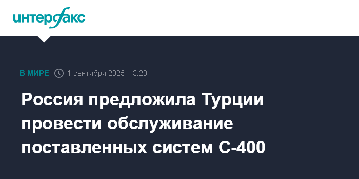 Москва. 1 сентября. INTERFAX.RU - Москва предлагает Анкаре провести комплексное обслуживание ранее поставленных систем С-400, сообщил директор Федеральной службы по военно-техническому сотрудничеству РФ Дмитрий Шугаев.