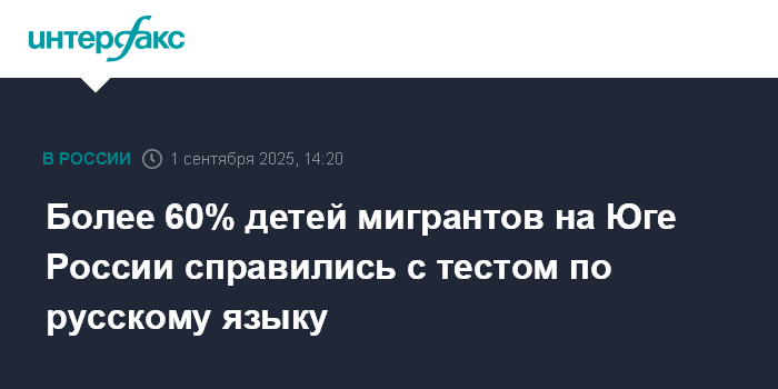 Москва. 1 сентября. INTERFAX.RU - Обязательное тестирование на знание русского языка для приема в школы РФ в регионах Южного и Северо-Кавказского федеральных округов прошли 570 детей мигрантов, успешно справились с заданием - 348 человек, сообщают органы власти субъектов ЮФО и СКФО.